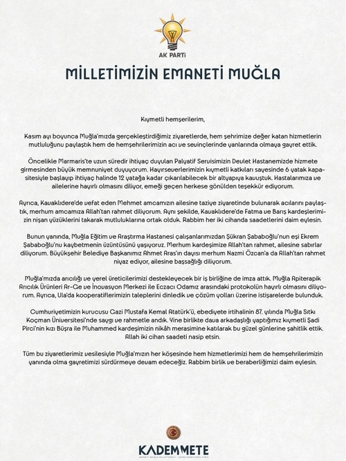 Adalet Ve Kalkınma Partisi Muğla Milletvekili Kadem Mete'nin KASIM ayı faaliyetlerini yayınlıyoruz.