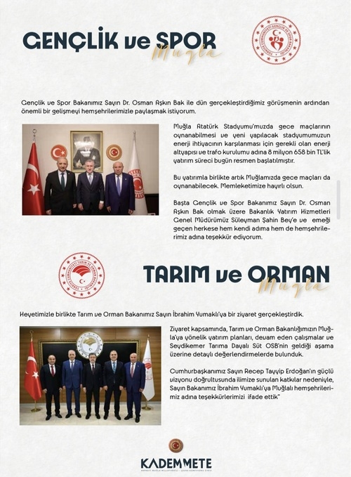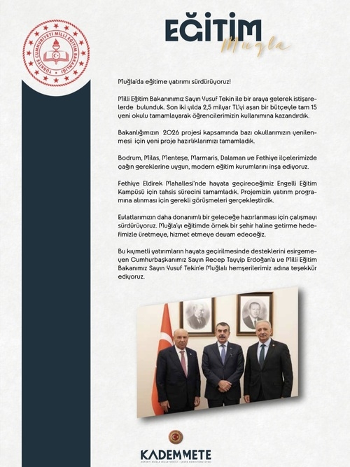 Türkiye Yüzyılı vizyonu doğrultusunda Muğla’nın geleceğini daha güçlü ve planlı bir yapıya kavuşturmak için çalışmaların aralıksız sürdüğünü belirten Mete, ay boyunca ulaşımdan eğitime, tarımdan gençlik ve spor yatırımlarına kadar birçok alanda önemli adımlar atıldığını ifade etti.